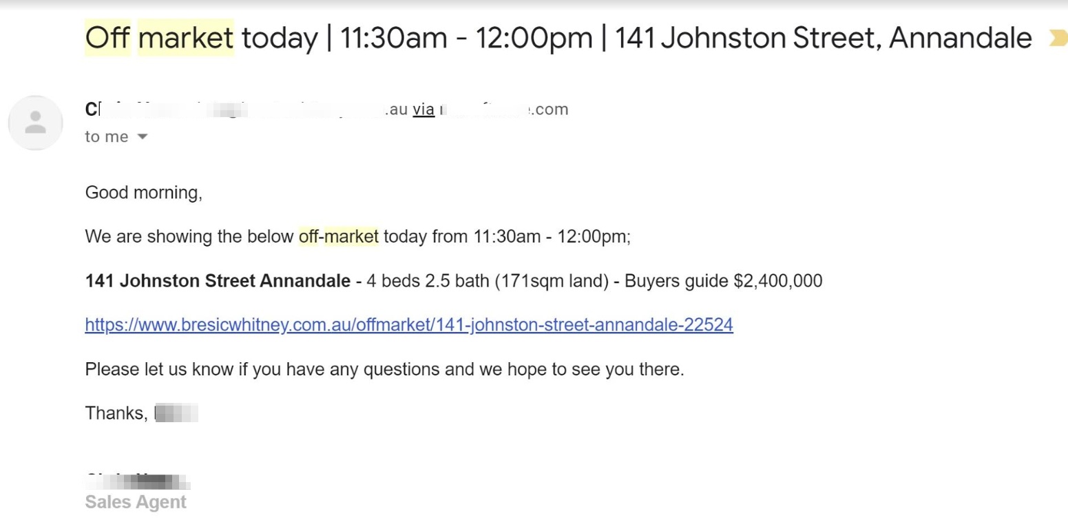Examples of off-market listings offered to select buyers before they’re listed online: