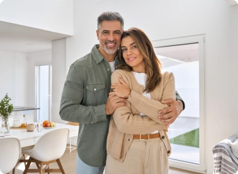 Happy couple embracing in their modern living room, representing homeownership and financial stability.